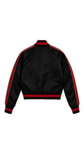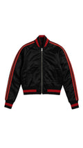 Bomber jacket Black leather trims, raglan sleeves, side pockets, striped ribbed trims, green reverse with white leather trims and side pockets Zip fastening through front 100% silk; trim: 100% leather; trim2: 85% cotton, 15% cashmere; lining: 100% silk.